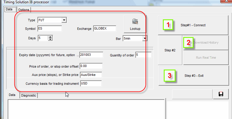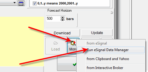 a) Click there "Data manager" button to run e-Signal service. Wait several second while the program will run e-Signal software.