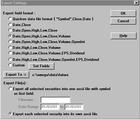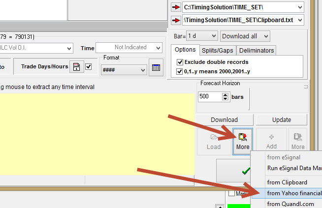 Almost all data feed systems allow saving price history data into text formats (Excel). Usually Timing Solution is able to read these files (now, in April, 2012, it supports more than 1000 different text formats). If we face with something very specific, you can always send me the example of this data (e-mail it to timingsolution@rogers.com), and this format will be added to a special program called "Rare Format". This program converts specific text formats into the format readable by Timing Solution software. Therefore, Timing Solution covers practically all available data formats. To download the "Rare Format" program, click here.